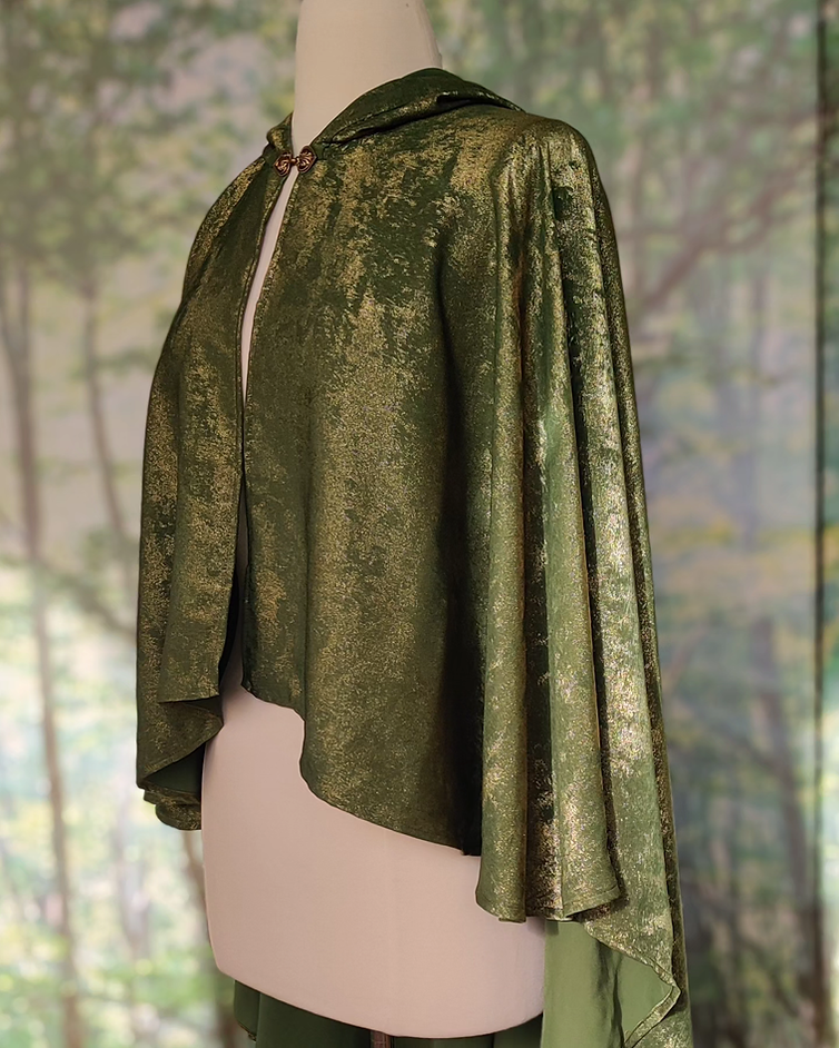 Made from a lightweight green and gold foil fabric, its got a beautiful flowing asymmetrical hem and is finished with a golden clasp.