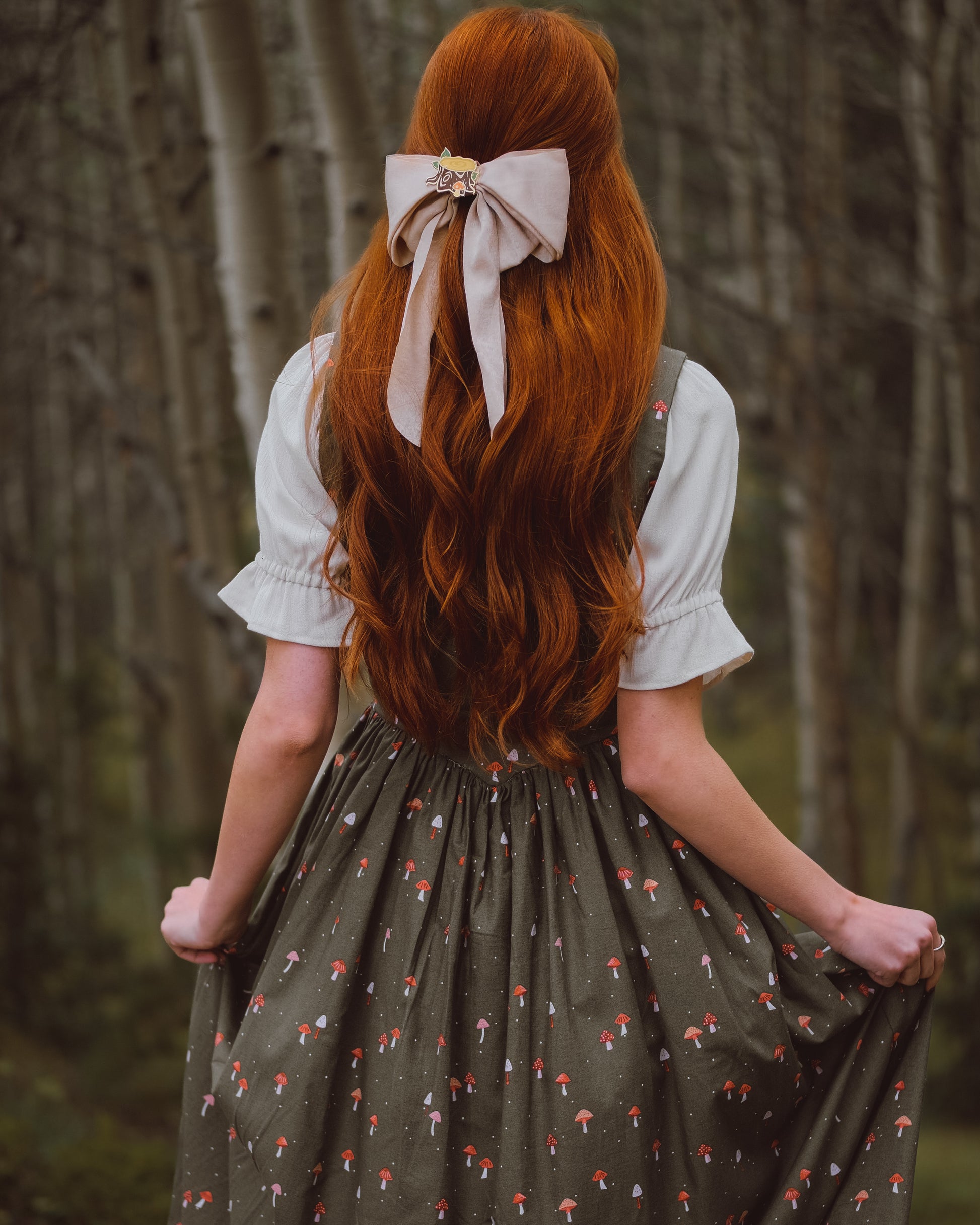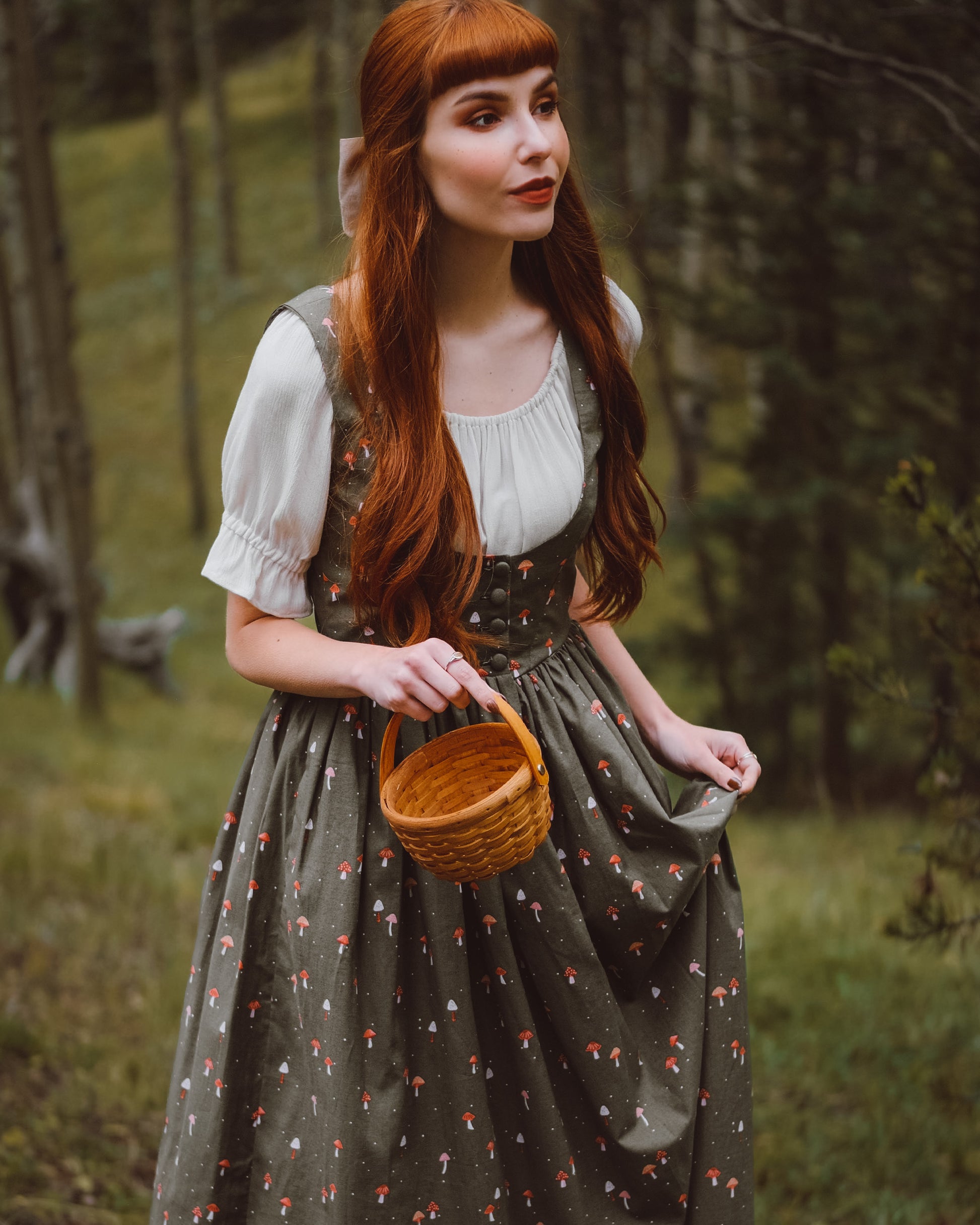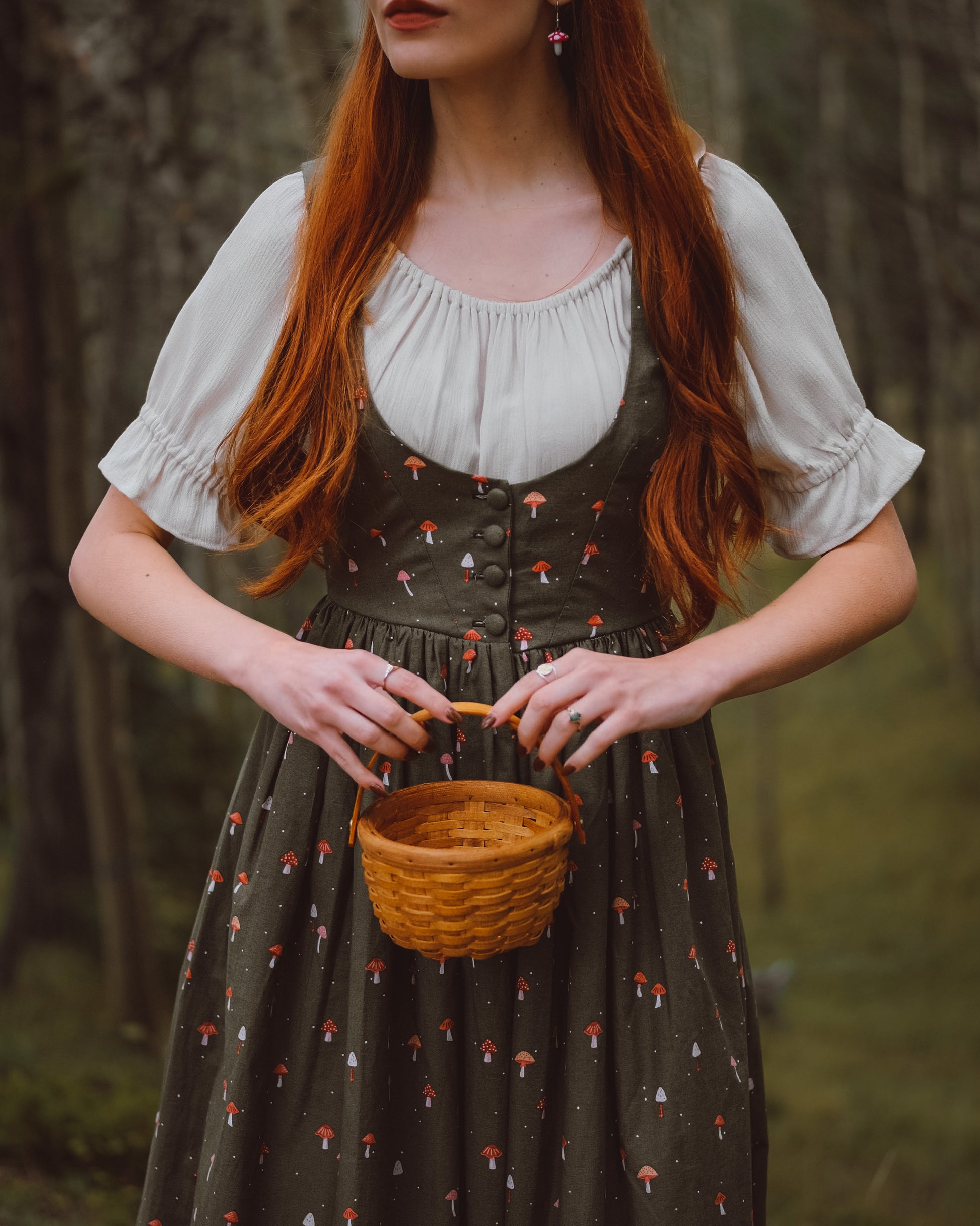 This beautiful dress consists of a fitted bodice and full skirt, dark green with a pattern of forest mushrooms throughout. Fabric buttons down the front, pointed waist at the back.