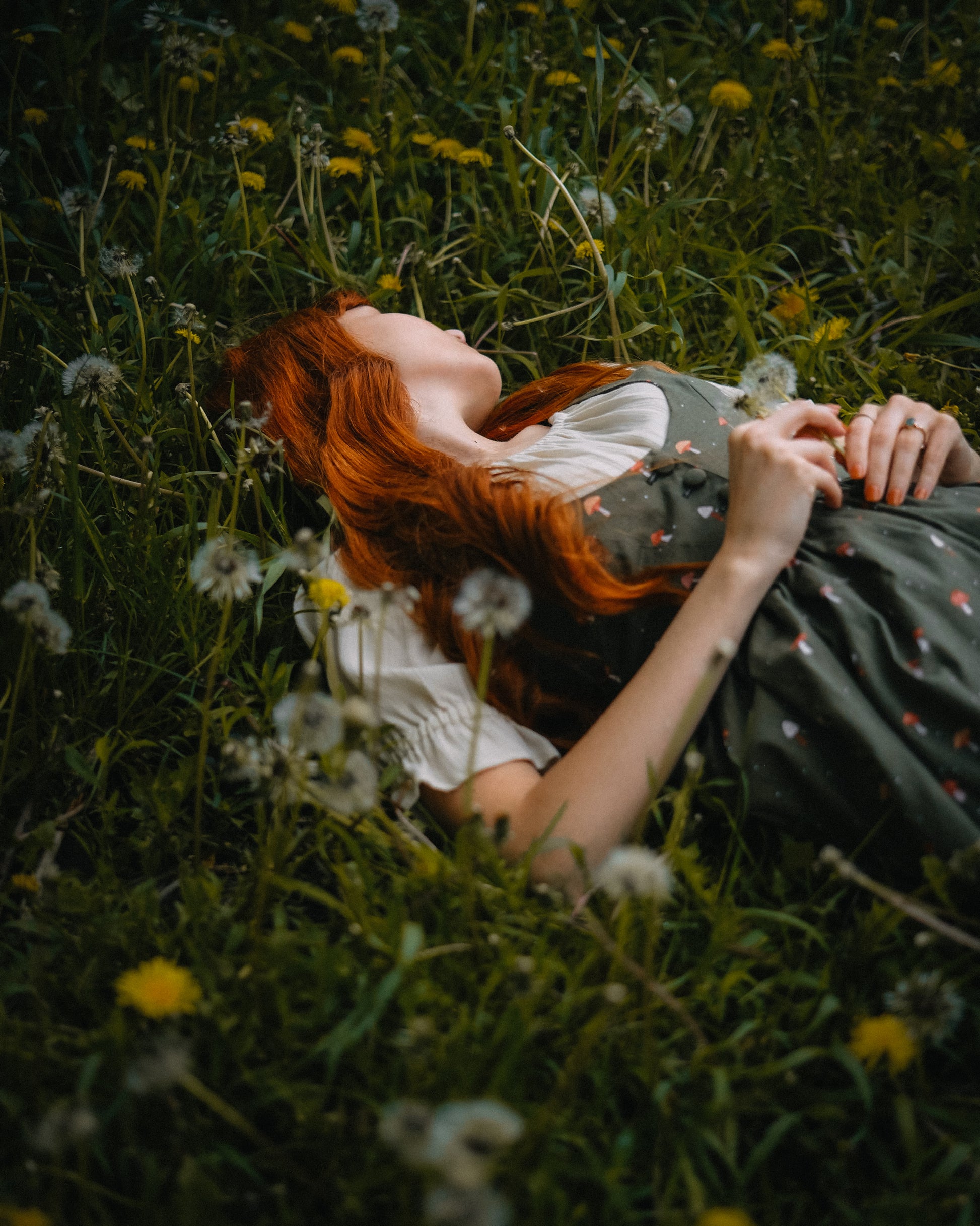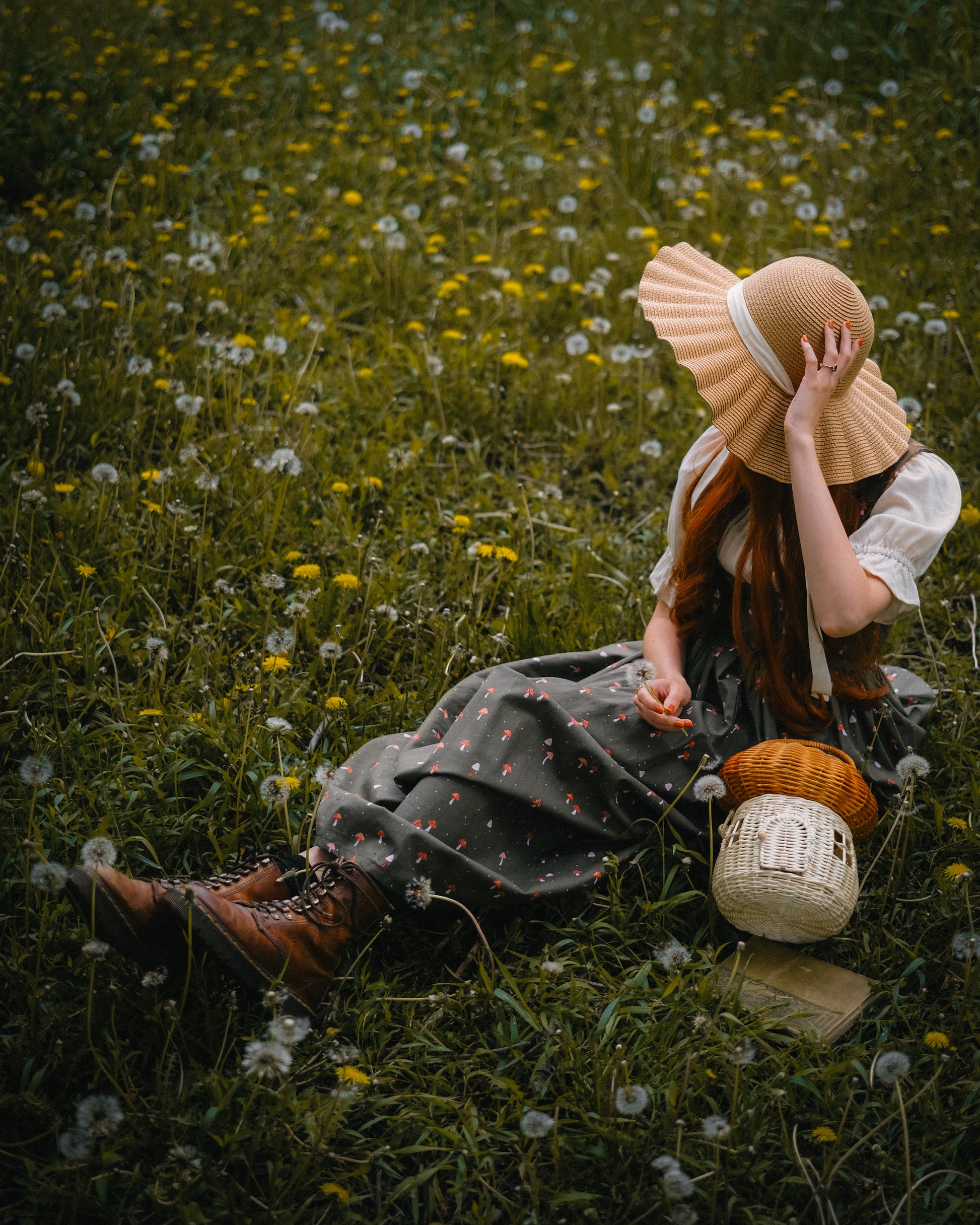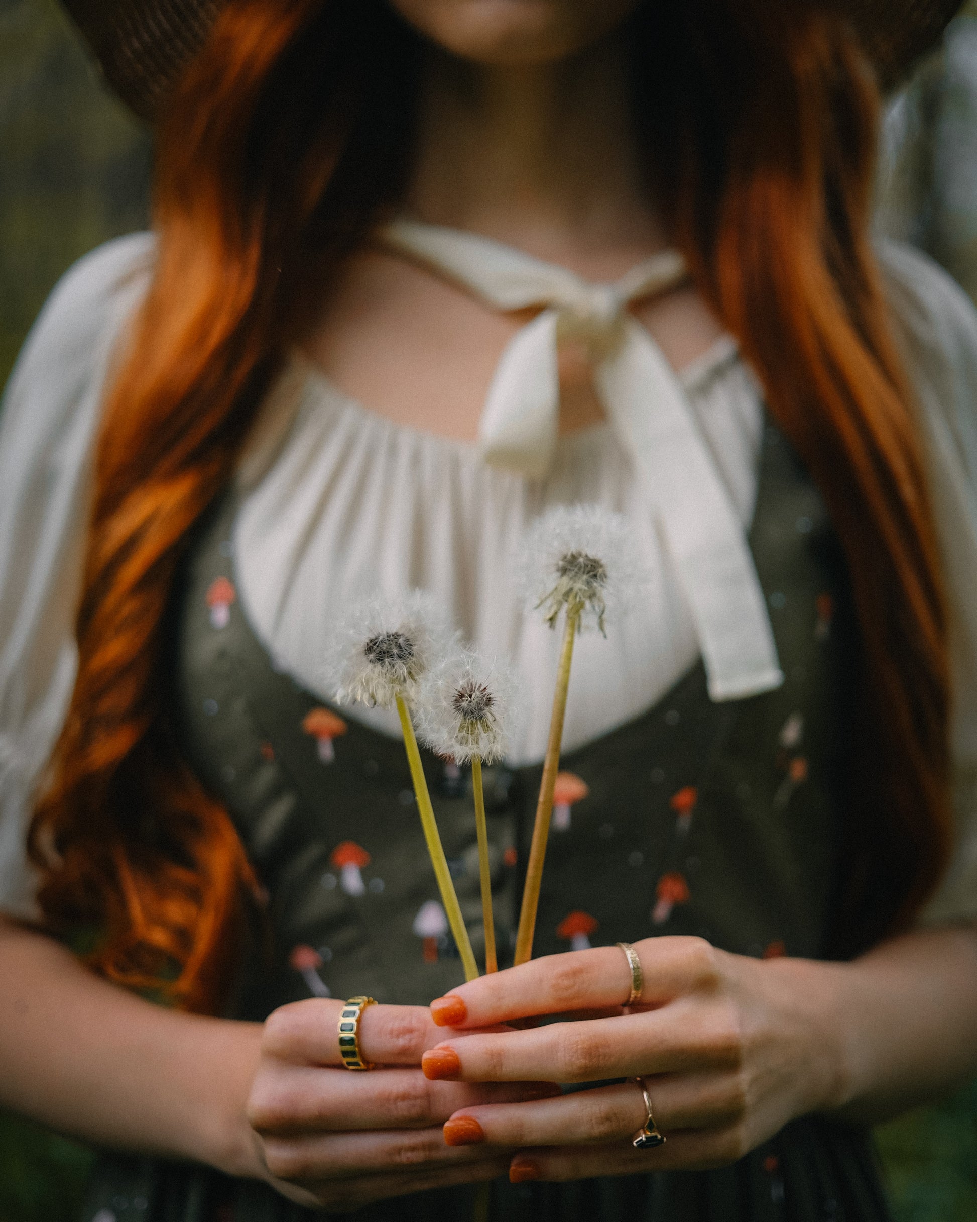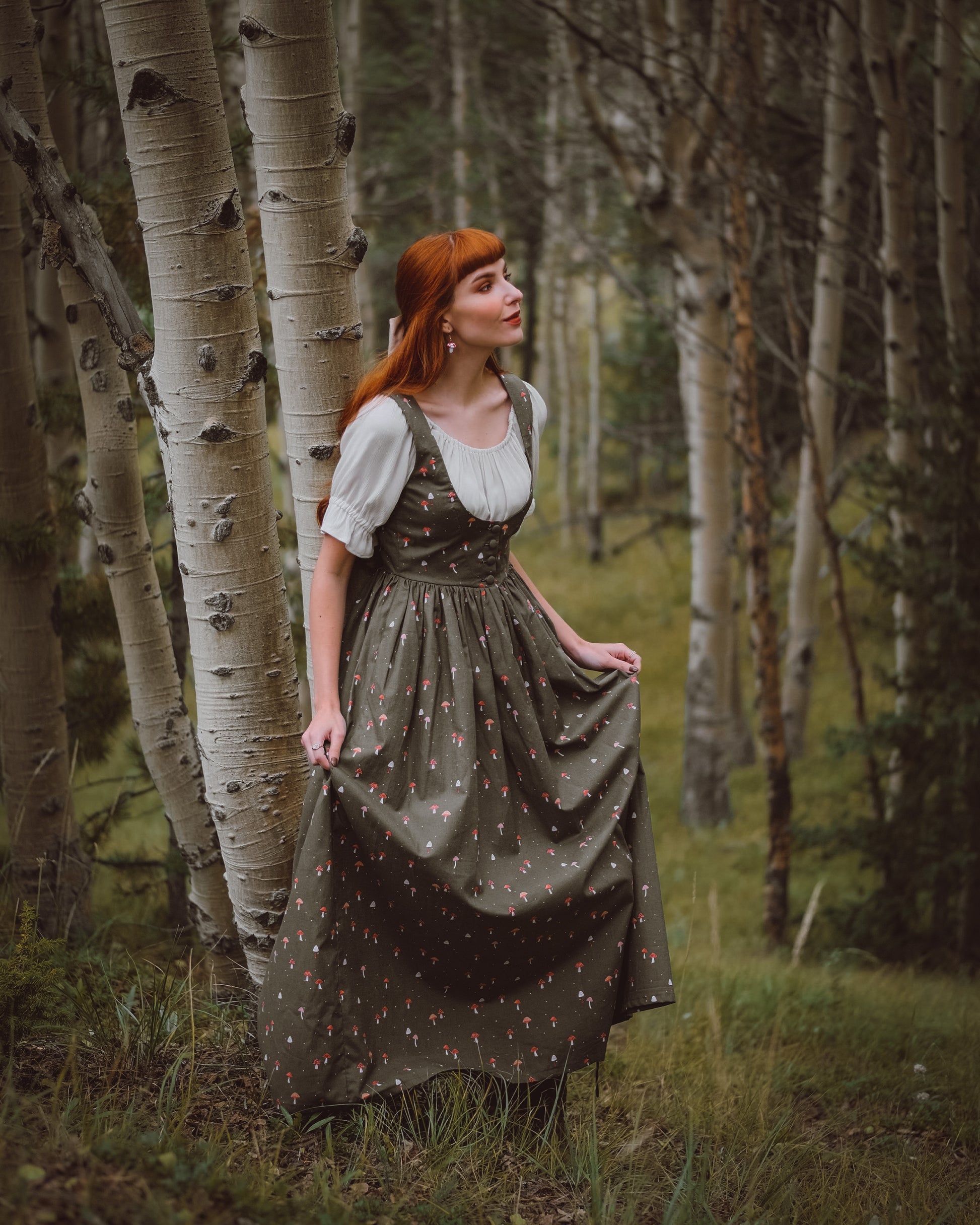 This beautiful dress consists of a fitted bodice and full skirt, dark green with a pattern of forest mushrooms throughout. Fabric buttons down the front, pointed waist at the back.
